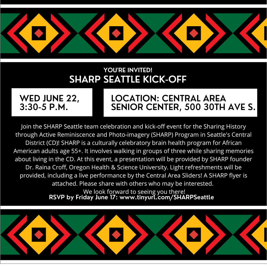 Join the SHARP Seattle team celebration and kick off event at the Central Area Senior Center. To learn more, see our SHARP Seattle flyer.