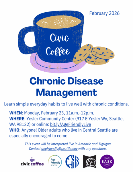 Civic Coffee is a monthly event by Seattle Human Services where older people can meet community leaders and local government officials, ask questions and provide feedback. It is produced in partnership with The Seattle Public Library. Interpretation is offered by advance request (via agefriendly@seattle.gov). See links at the top of this page for topics and to join online, by phone or in-person, or to download event flyers in multiple languages.